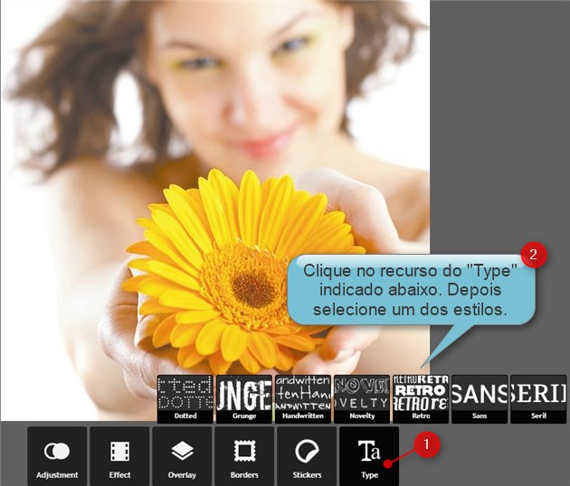 Assim que sua foto for carregada, selecione a opção “Type“, repare que aparecerá vários modelos de fontes disponíveis, clique sobre os modelos para escolher. Com o modelo já escolhido, digite seu texto no local indicado (1), depois selecione uma fonte (2), faça os ajustes de alinhamento e escolha uma cor para o texto (3), em seguida, você pode está movendo seu texto para qualquer local dentro da imagem (4), e para concluir clique em “Appy” (5).