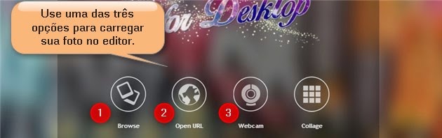 Na opção 1 você pode abrir uma foto direto do seu computador, na opção 2 é necessário copiar o endereço (url) da imagem já hospedada na internet, já na opção 3 é possível tirar uma foto diretamente de sua webcam e abri-la instantaneamente no editor. Vale considerar que a primeira opção é uma das mais práticas e fáceis.